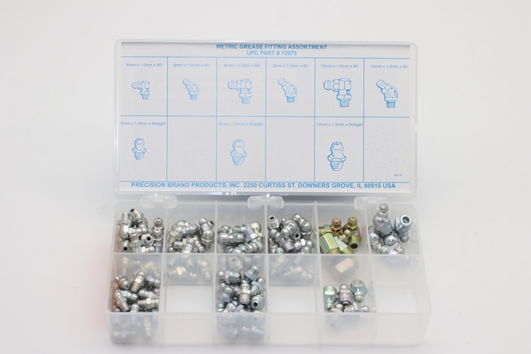 Buy Precision Brand Grease Fittings assortment kits here. Each kit has multiple sizes to choose from. Grease Fittings are made with push type, plated fittings to permit lubricants to flow. They have a built-in ball that under spring pressure, prevents dirt from entering. Precision Brand Grease Fitting assortment kits are well-labelled with sizes clearly indicate. It is a handy kit for shop toolroom.