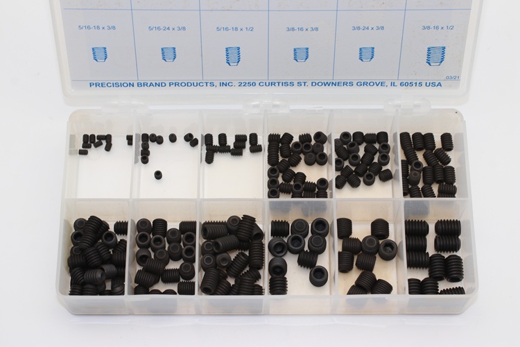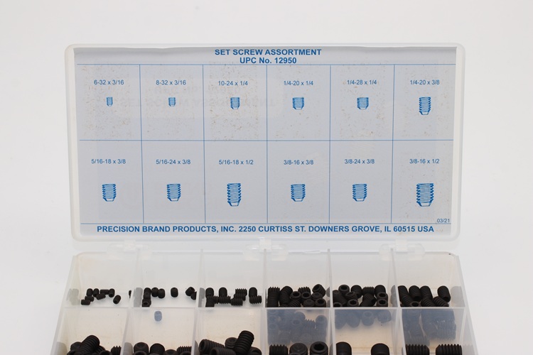 Use socket head set screws with cup point for positive torque. Precision Brand is able to supply these well-labelled handy kits for shop tool rooms. Keeping them on hand when needed saves time and money. Precision Brand socket head set screw assortment kits are packed neatly in a plastic box for easy retrieval.