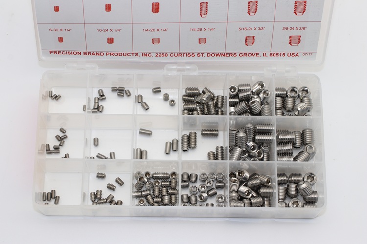 Use socket head set screws with cup point for positive torque. Precision Brand is able to supply these well-labelled handy kits for shop tool rooms. Keeping them on hand when needed saves time and money. Precision Brand socket head set screw assortment kits are packed neatly in a plastic box for easy retrieval.