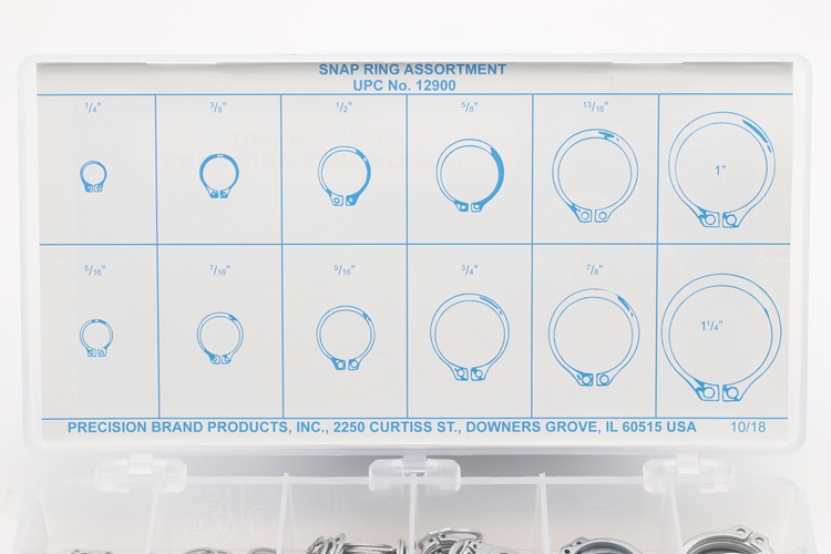 Precision Brand Snap Rings are external-based and made of spring steel with black phosphate coating. They are used to retain pulleys, gears or wheels on shafts. Precision Brand Snap Ring kits are handy for shop toolroom or toolbox. Having them on hand when needed saves time and money.